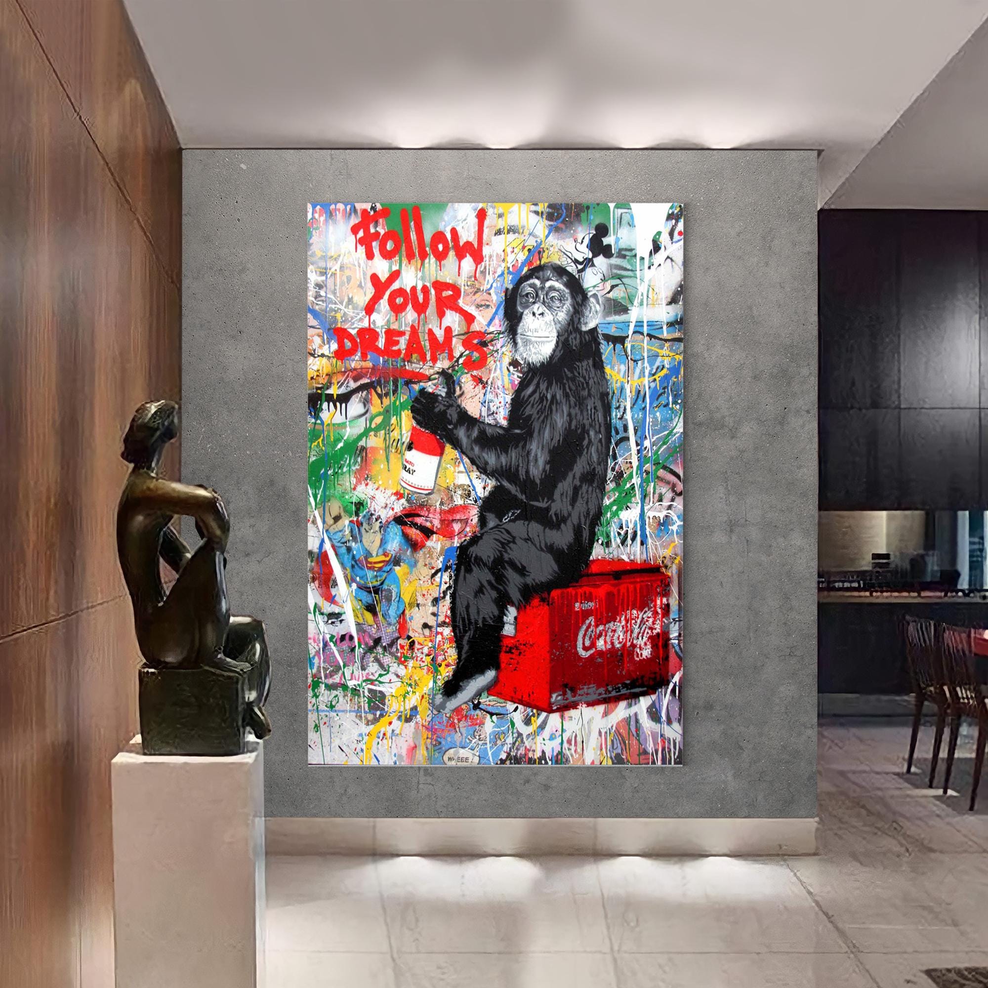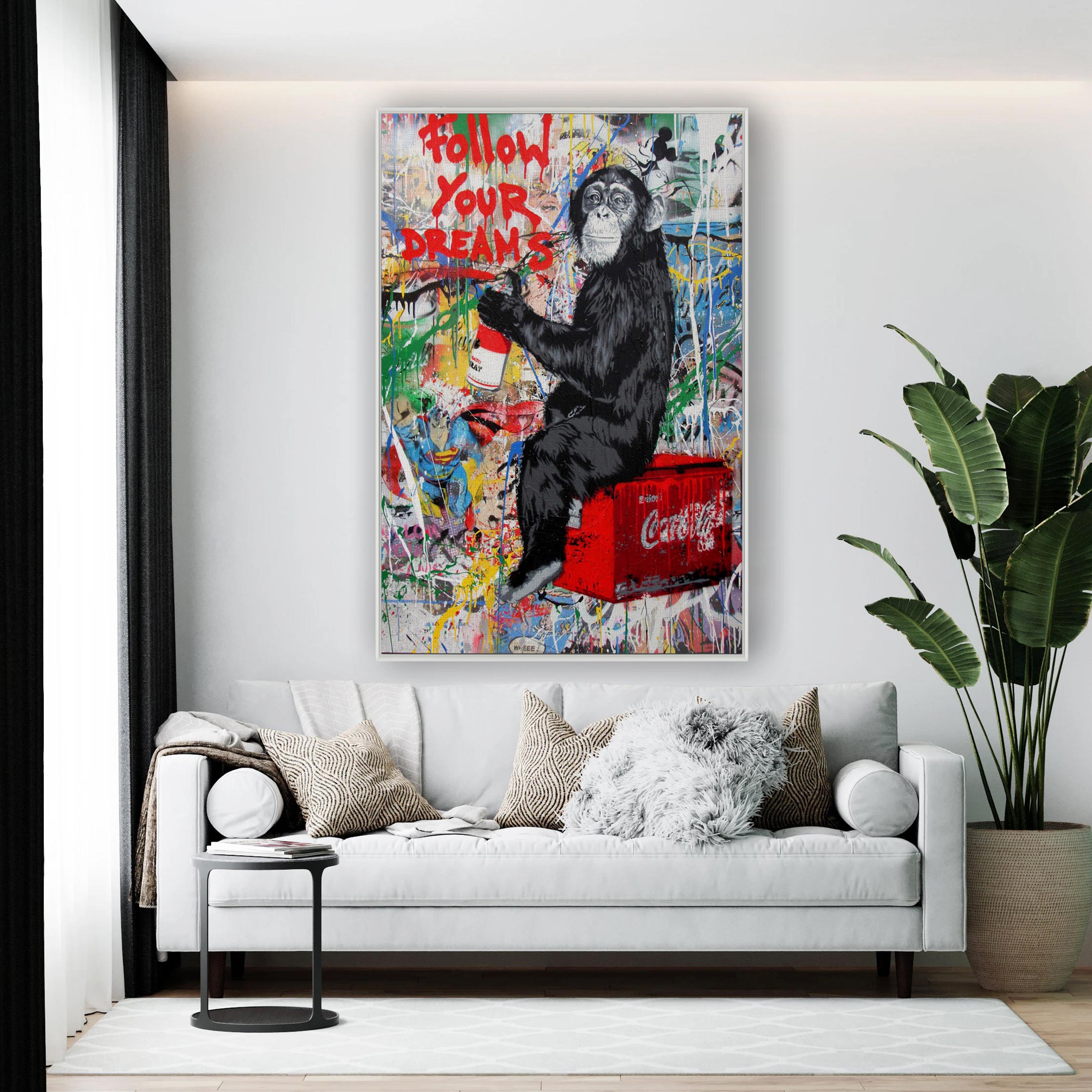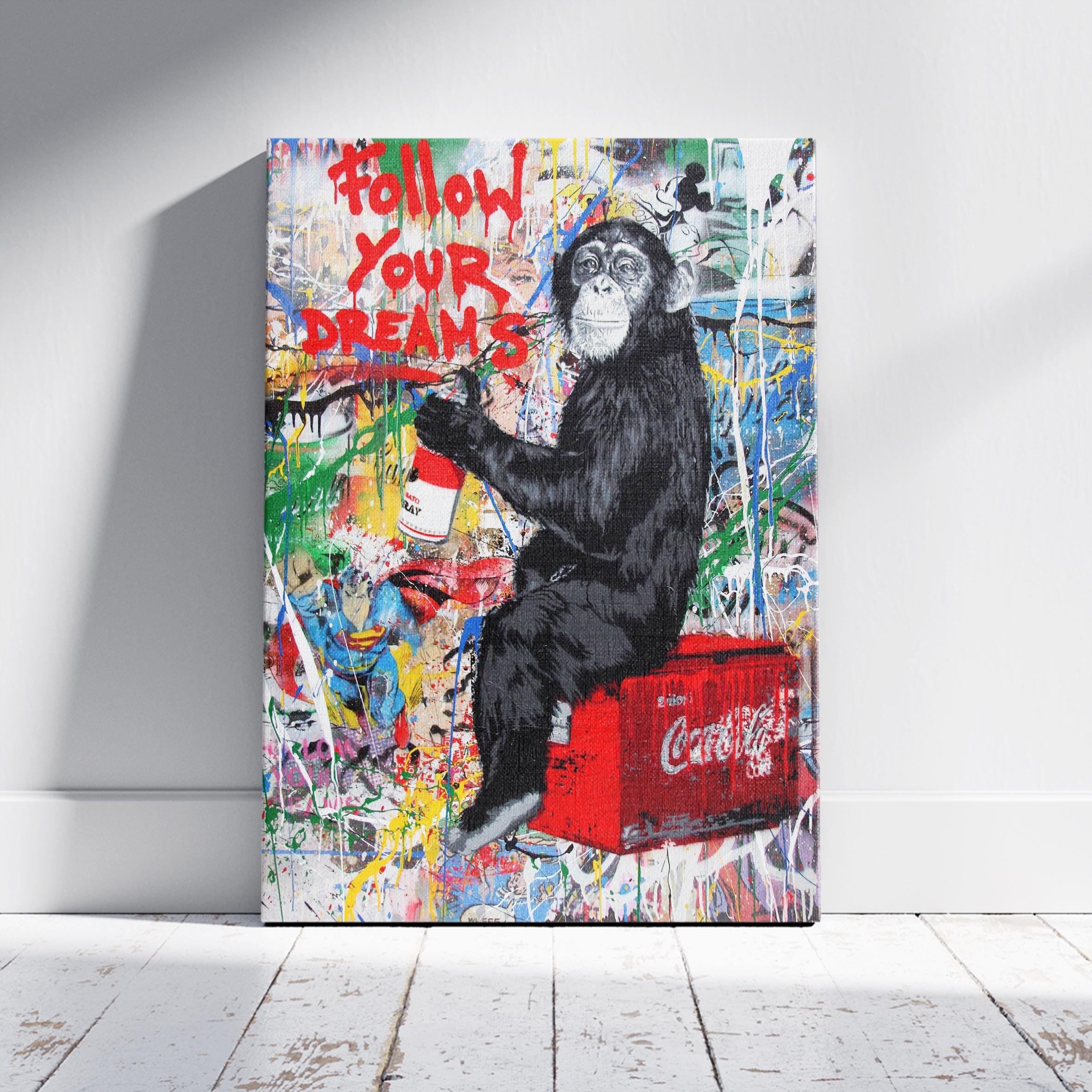 Follow Your Dreams Pop Art Canvas Print | Banksy Monkey Graffiti, Street Wall Art Poster for Inspirational Decor, Modern Home Decor, Ready to Hang.