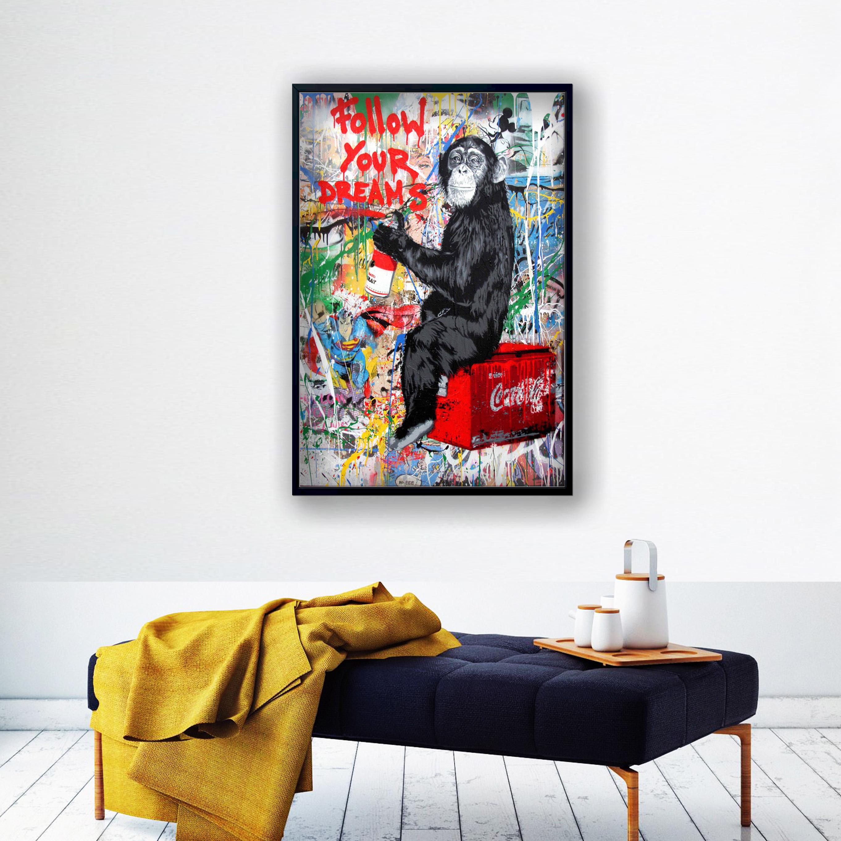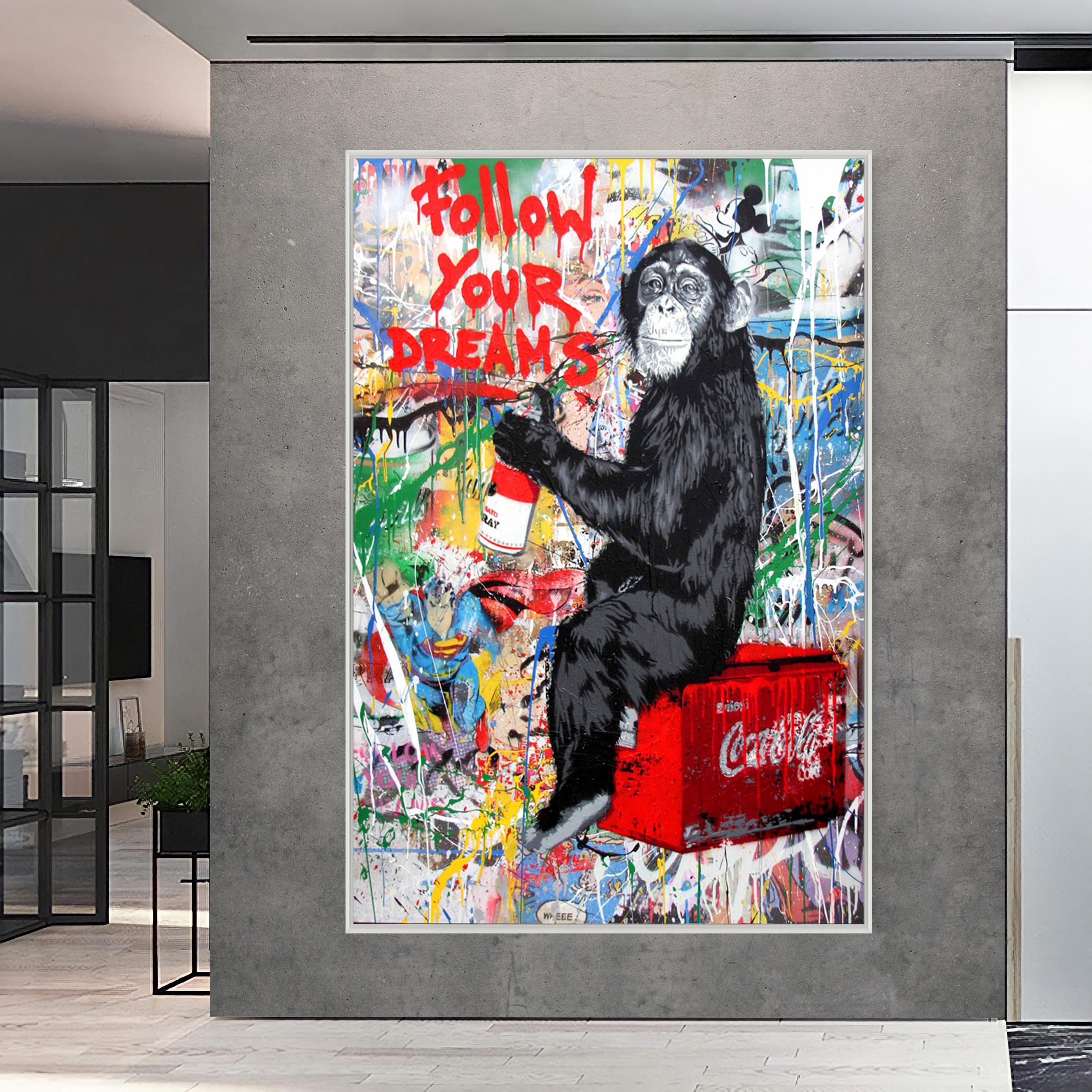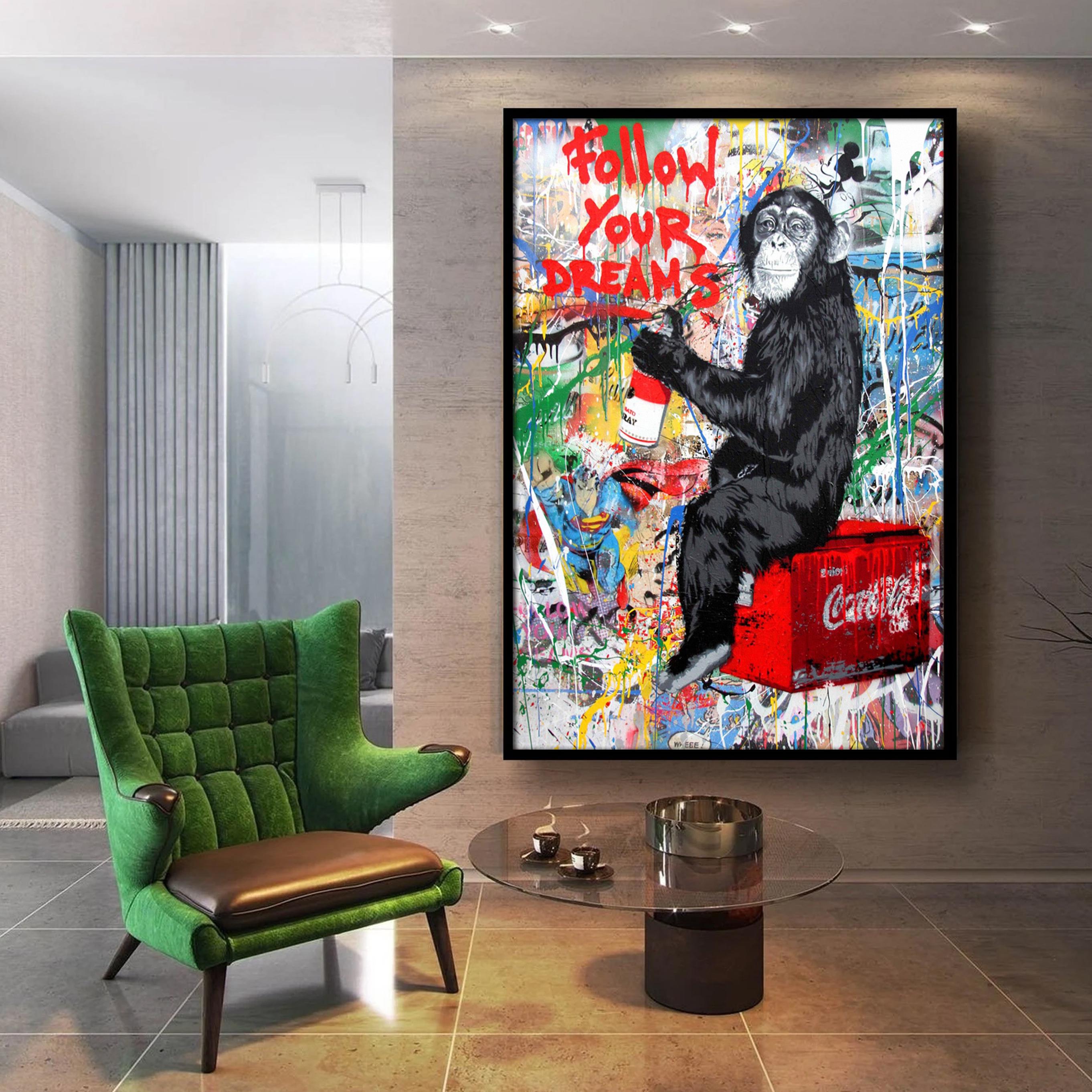Follow Your Dreams Pop Art Canvas Print | Banksy Monkey Graffiti, Street Wall Art Poster for Inspirational Decor, Modern Home Decor, Ready to Hang.