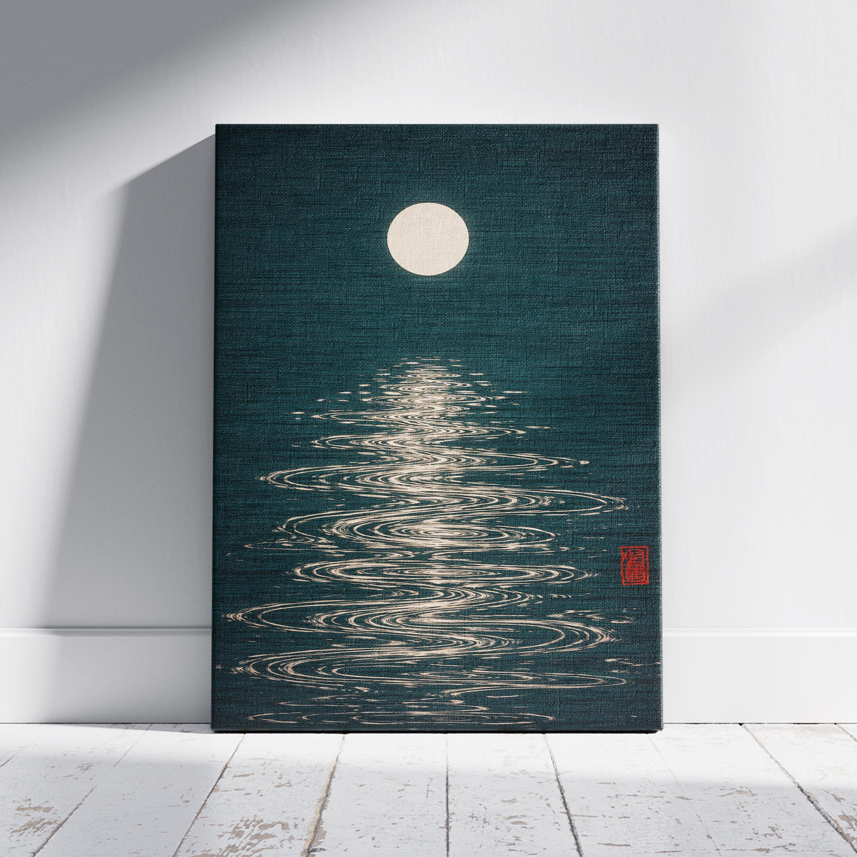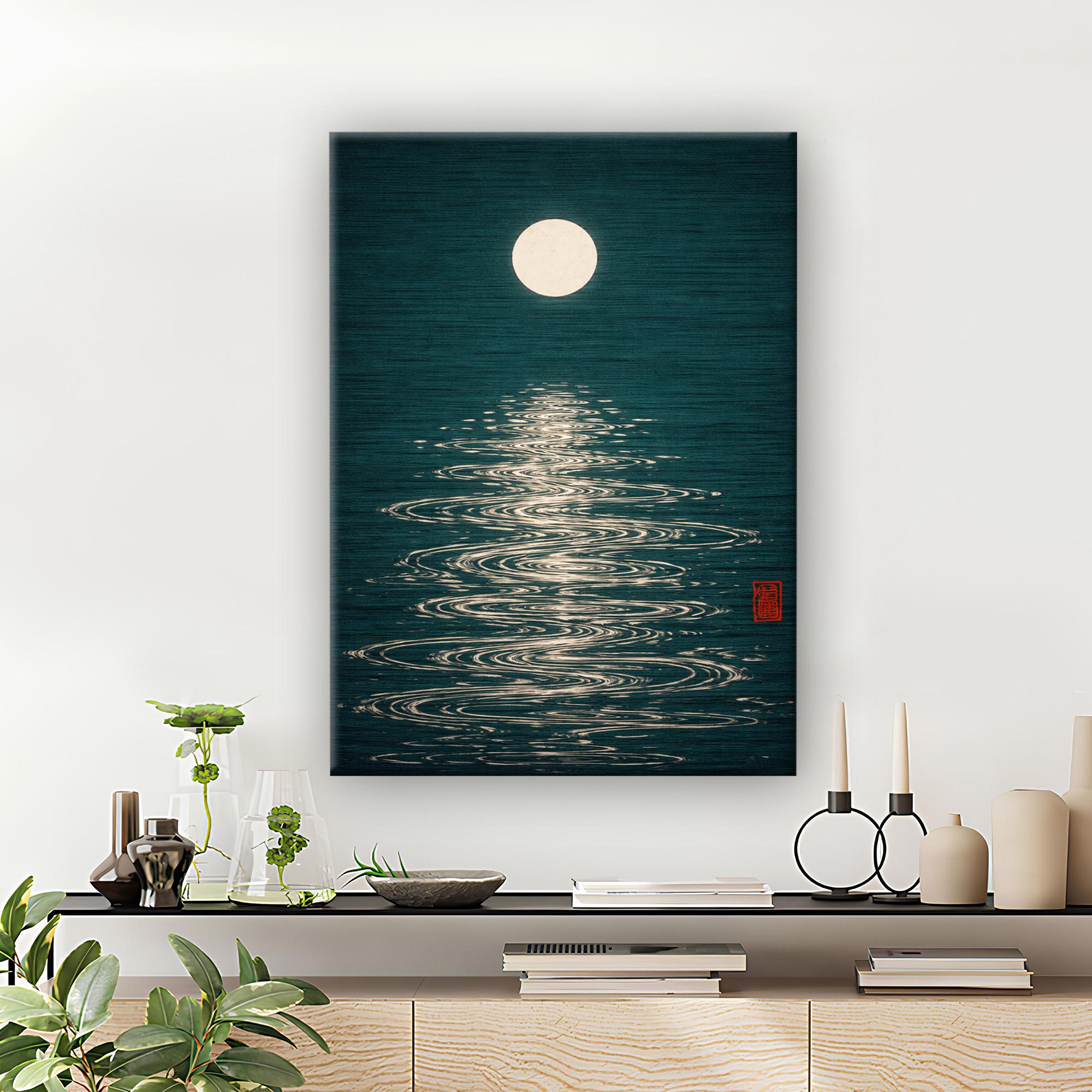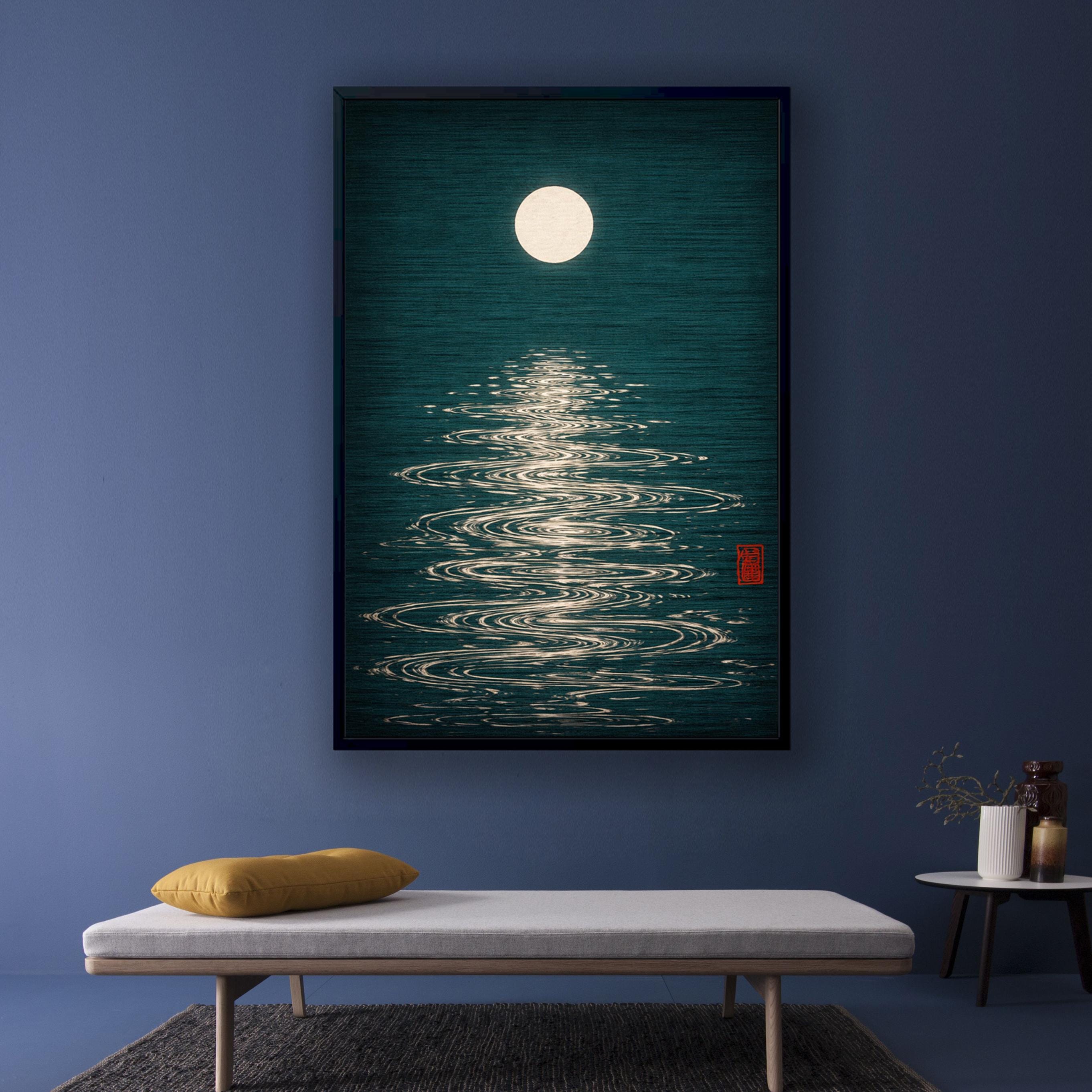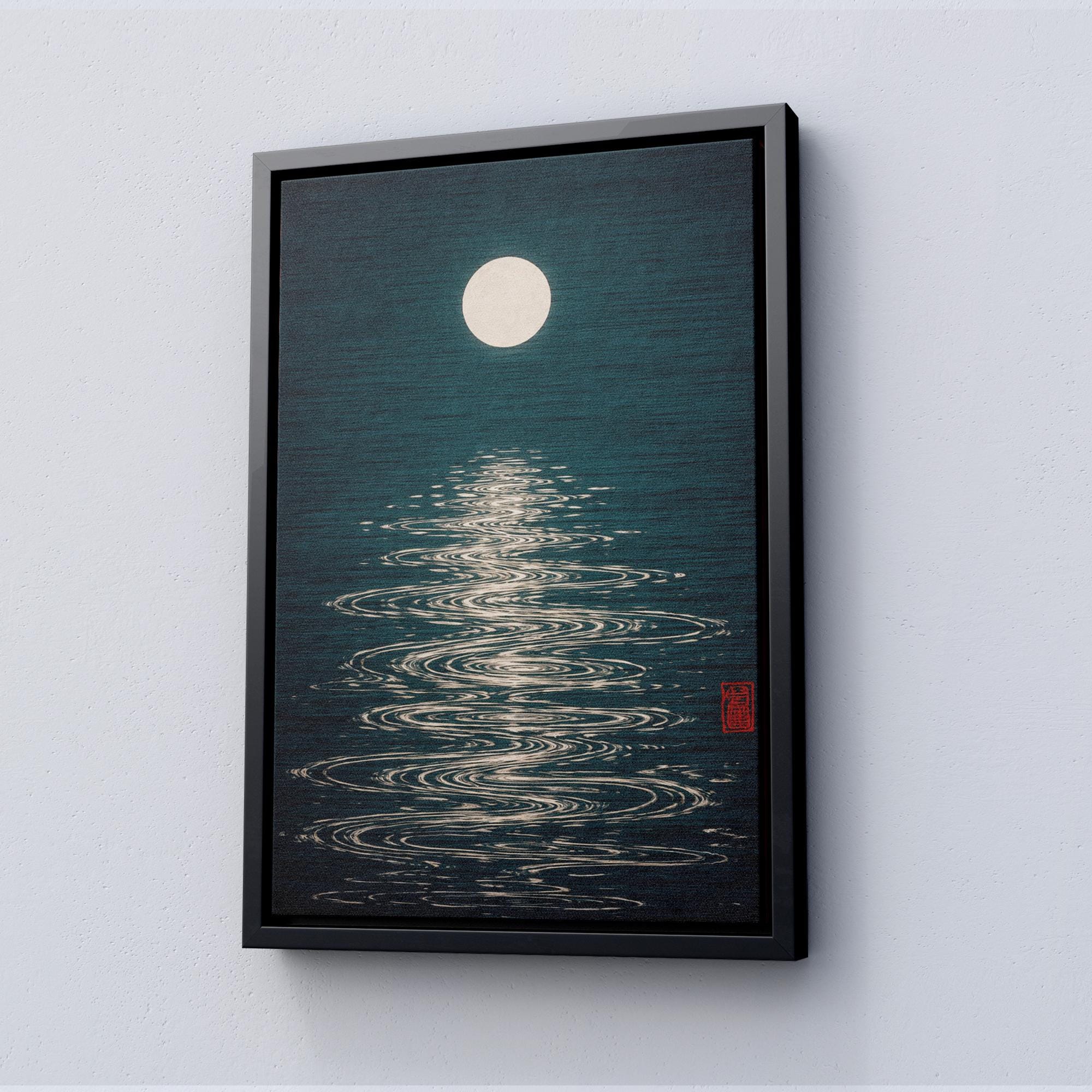 Moon Reflection Poster, Japanese Minimalist Art Print, Retro Night Sky Wall Art, Mid Century Modern Decor, Vintage Zen Poster Design, Ready to Hang.