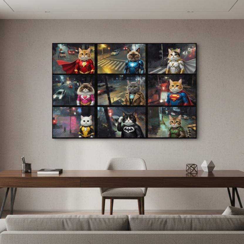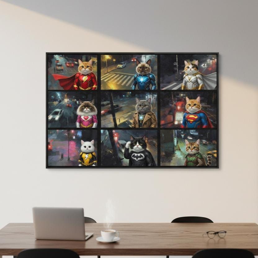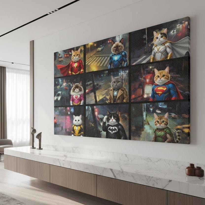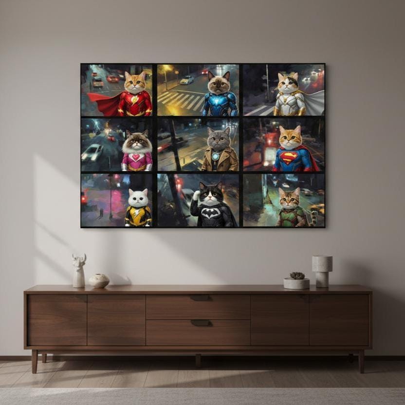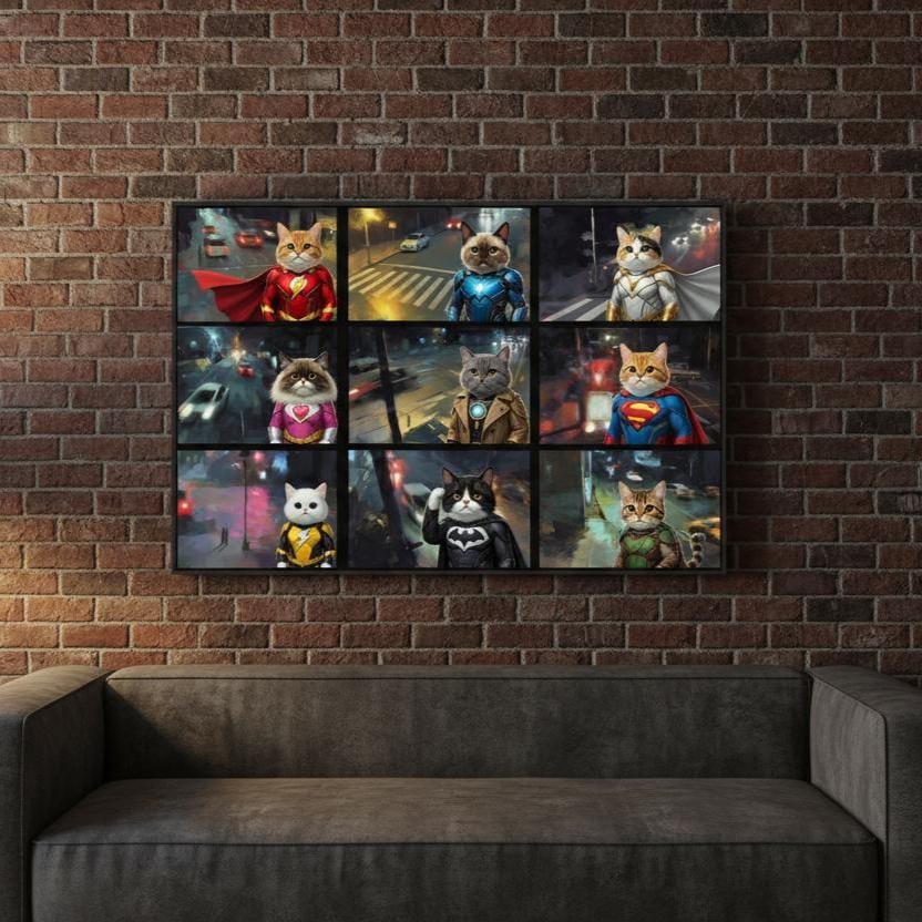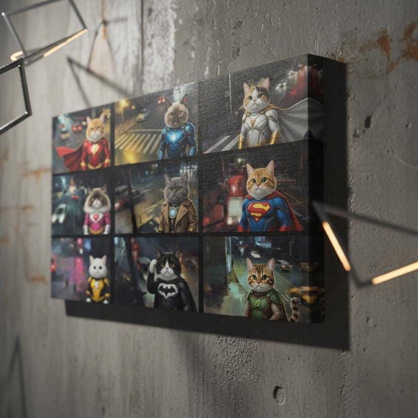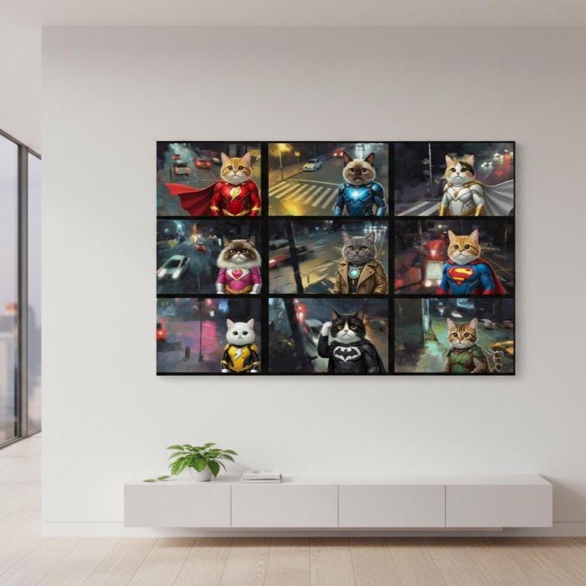 Superhero Cat Canvas Wall Art, Hero Cats Poster, Animals on Camera, Ready to Hang.