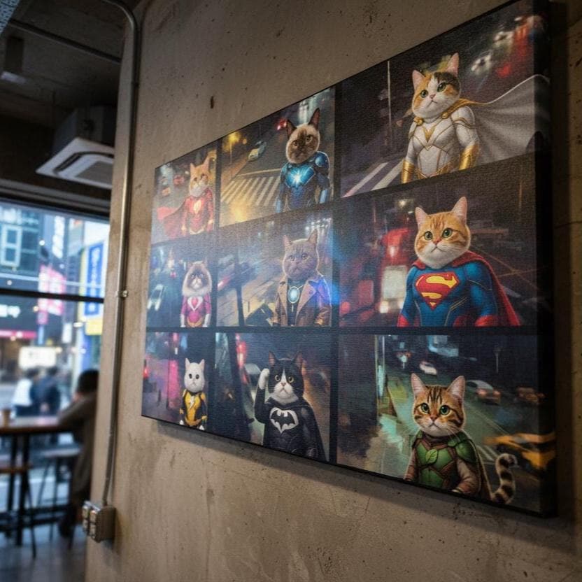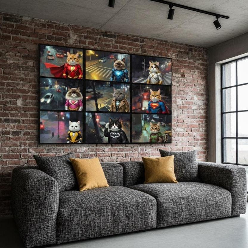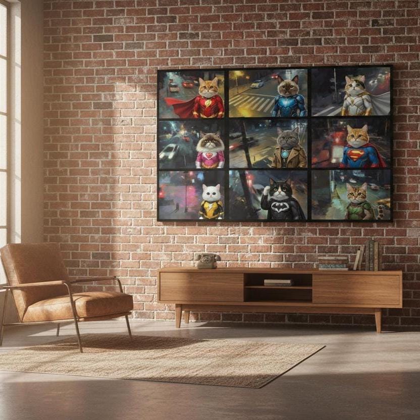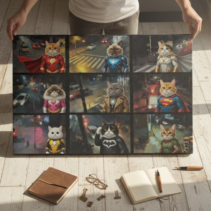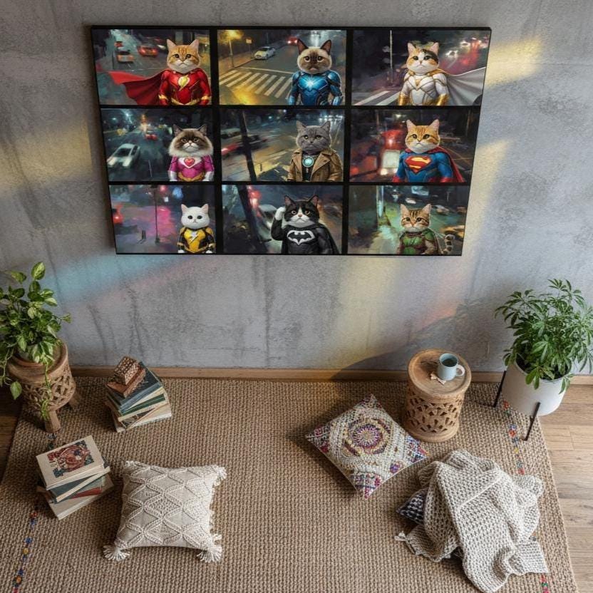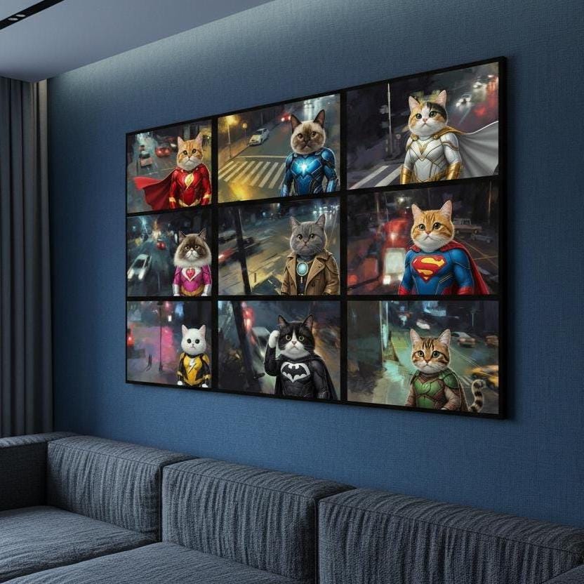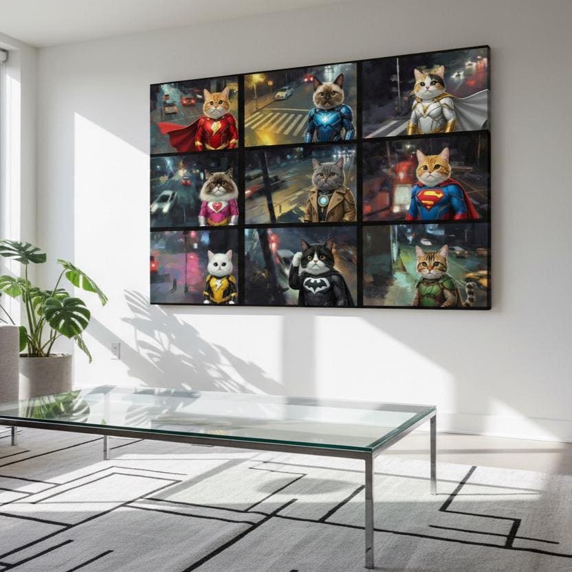 Superhero Cat Canvas Wall Art, Hero Cats Poster, Animals on Camera, Ready to Hang.